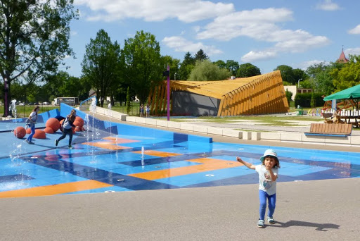 Fontanna... zaraz po wejściu Klu zamoczyła końcówki spodenek, zaczęła marudzić i chciała wychodzić. Ona tak ma, że jak ma mokrą plamkę, to trzeba jej wytrzeć, a najlepiej zmienić ubranko. Na szczęście udało się jej wytłumaczyć, że skoro ubranku już i tak jest mokre, to niech sobie tutaj pobiega, niech moczy, a na koniec przebierzemy się w suche rzeczy. Nie była początkowo przekonana, temat kilka razy wracał, ale generalnie udało się ją namówić do kontynuacji zabwawy w fontannie.
